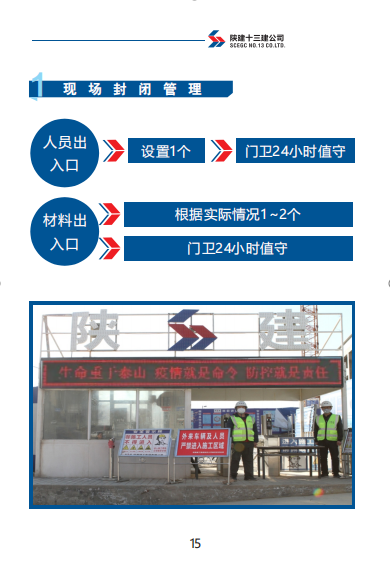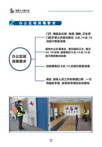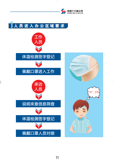 《手冊》包括陜建十三建公司復工準備工作、復工前驗收流程、辦公區(qū)管理、施工區(qū)管理、宿舍及餐廳管理、后勤保障、應急管理七部分內(nèi)容。