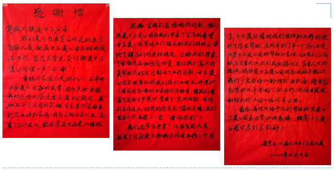 十三建公司結合每一名貧困戶的實際情況,按照就近安排的原則,把他們都安排在離家比較近的項目,既方便上班,又能照顧家里。為了讓貧困人員更好地適應崗位需求,項目部對他們進行了崗前培訓和安全教育,普及文明施工知識,開展相關技能培訓。如今過去一個月了,所有貧困就業(yè)人員都及時拿到了第一個月工資,為了表達他們的心意,聯(lián)名給十三建公司寫了一封“感謝信”。