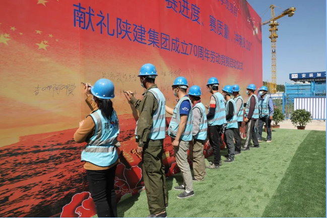 啟動儀式上,公司生產(chǎn)管理部副部長路潔宣讀了《勞動競賽實(shí)施方案》,明確此次勞動競賽旨在加快施工進(jìn)度,提高生產(chǎn)效率,提高工程質(zhì)量、確保安全生產(chǎn),保證8月10日交付使用。施工單位、勞務(wù)公司代表分別作表態(tài)發(fā)言。他們表示將會以實(shí)際行動推進(jìn)項(xiàng)目建設(shè),不辱使命、全力以赴,奮力完成各項(xiàng)任務(wù)目標(biāo),為陜建集團(tuán)成立70周年獻(xiàn)禮。隨后,全體人員在勞動競賽背景墻簽字承諾。