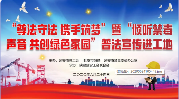 在第33個(gè)國(guó)際禁毒日來臨之際,為全面貫徹落實(shí)習(xí)近平新時(shí)代中國(guó)特色社會(huì)主義思想和習(xí)近平總書記關(guān)于禁毒工作重要指示精神,切實(shí)提高農(nóng)民工法律意識(shí)和禁毒意識(shí),6月24日,由延安市總工會(huì)、市婦聯(lián)、市禁毒委員辦公室主辦,陜建延安工會(huì)聯(lián)合會(huì)承辦的“尊法守法 攜手筑夢(mèng)”暨“傾聽禁毒聲音 共創(chuàng)綠色家園”普法宣傳教育活動(dòng)在陜建十三建公司延安市新區(qū)信天游文創(chuàng)餐飲街項(xiàng)目舉行。