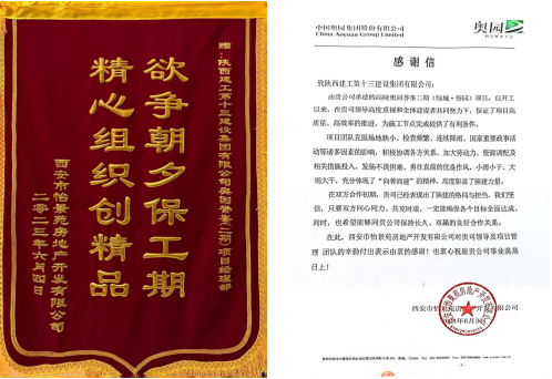 信中提到,陜建十三建集團自承建奧園譽峯(二期)項目以來,重合同、守信用,各項管理工作有序開展,項目建設(shè)穩(wěn)步推進。在項目建設(shè)期間,項目全體參建人員認真籌劃部署,緊盯目標任務(wù),抓進度趕工期,主動攻堅克難,增加資源投入,積極配合工程業(yè)主、監(jiān)理單位和行政管理部門,以不畏艱難、勇挑重擔的精神,為施工節(jié)點完成提供了有利條件。