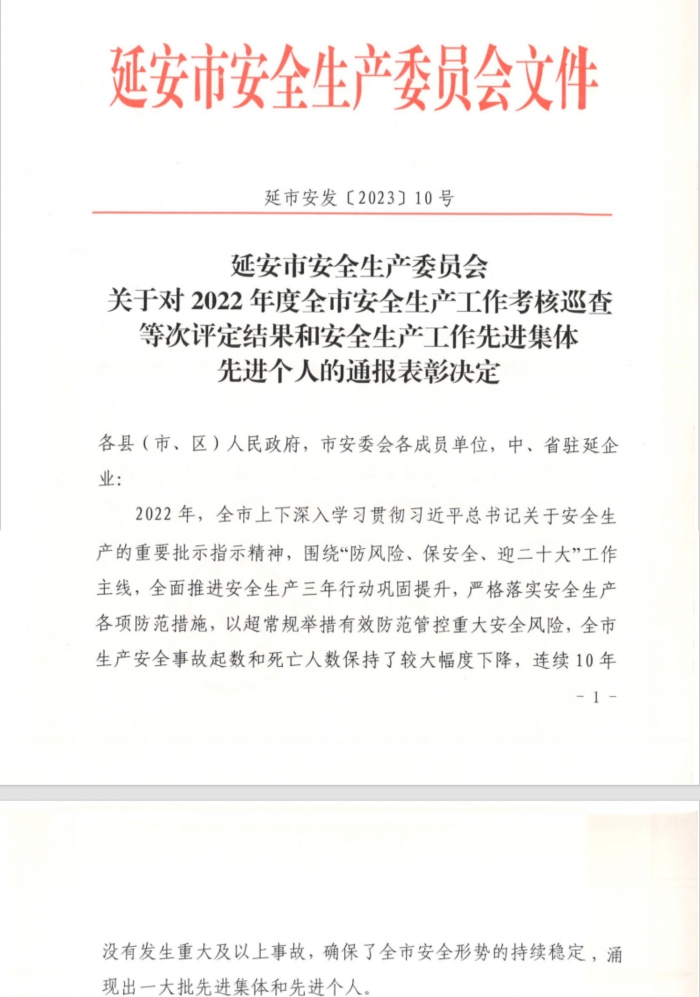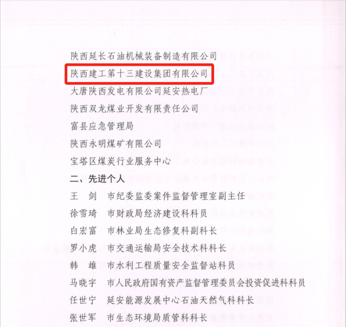 近日,延安市安全生產(chǎn)委員會表彰了2022年全市安全生產(chǎn)工作先進(jìn)集體和先進(jìn)個人,陜建十三建集團(tuán)獲評延安市安全生產(chǎn)先進(jìn)集體,這是集團(tuán)連續(xù)四年榮獲全市安全生產(chǎn)先進(jìn)集體表彰。