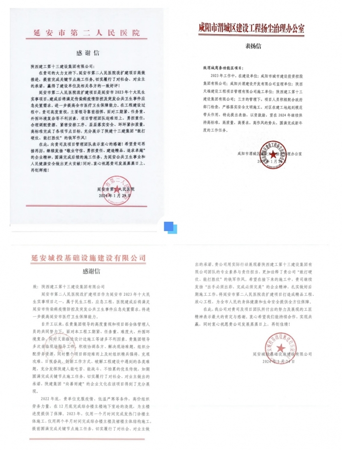 近日,集團(tuán)第二工程公司施工的延安市第二人民醫(yī)院改擴(kuò)建項(xiàng)目、咸陽(yáng)渭城商務(wù)功能區(qū)項(xiàng)目收到建設(shè)單位發(fā)來(lái)的感謝信、表?yè)P(yáng)信,對(duì)集團(tuán)在項(xiàng)目高質(zhì)量建設(shè)中的傾情付出表示感謝,為項(xiàng)目團(tuán)隊(duì)在施工過(guò)程中表現(xiàn)出的敬業(yè)精神表示贊揚(yáng)。